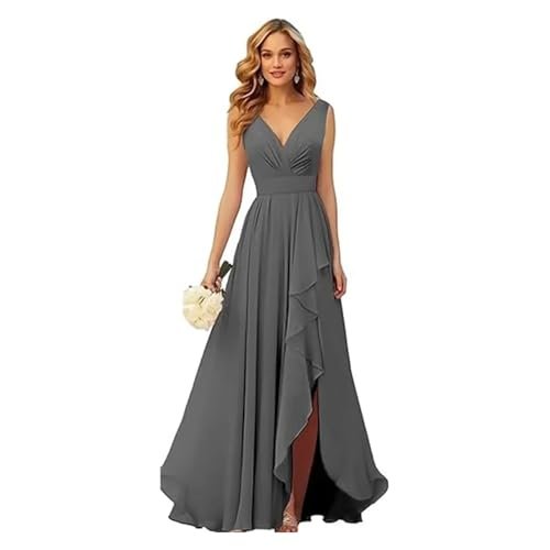 Elegant V-ringad chiffong veckad delad rygglös klänning för bröllopsgäster formella aftonklänningar golvlängd