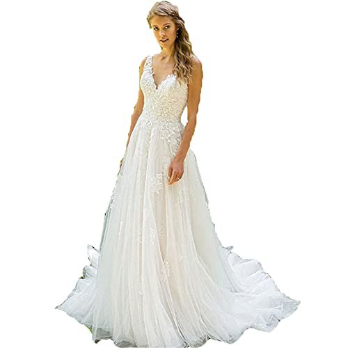 Shoudian Kvinnors elegant spets V-ringad ärmlös bröllopsklänningar brud...