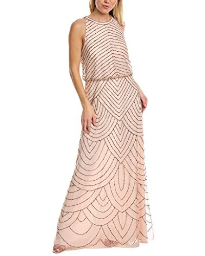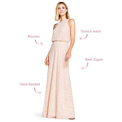 - Denna klänning har ett blouson-livstycke, en glittrande skulpterad pärlstav och en flödande rak kjol, perfekt för det kommande bröllopet eller galan.