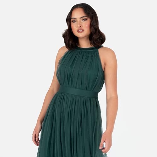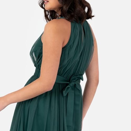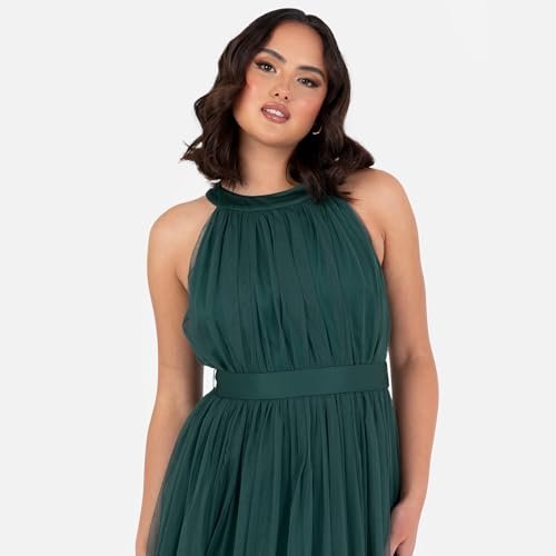 Lång aftonklänning: Den har en elegant halterneckning och en mjuk kjol som sträcker sig från midjan och ger klänningen en romantisk finish. Denna balklänning har ett satinbälte som hjälper dig att lyfta fram din midja. Den långa klänningen är avslutad med osynlig dragkedja och satindetaljer som gör den extremt elegant.