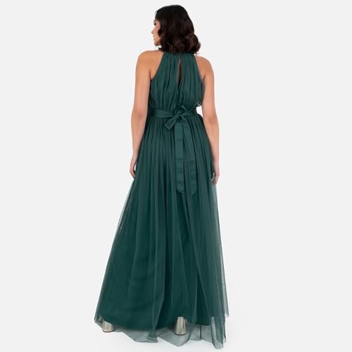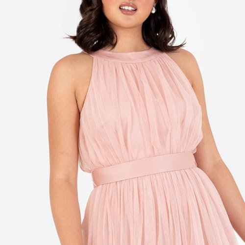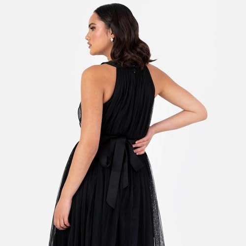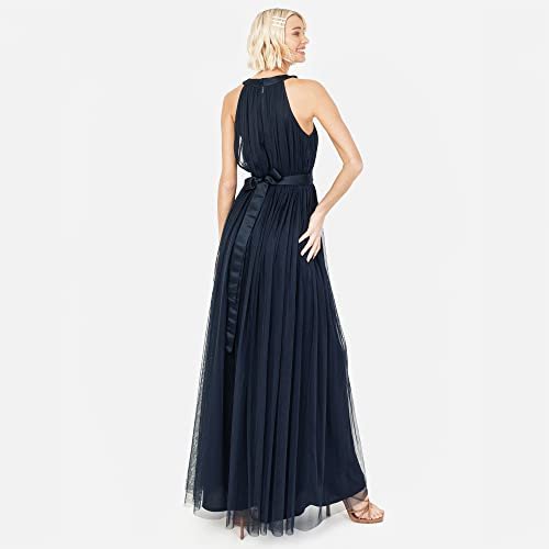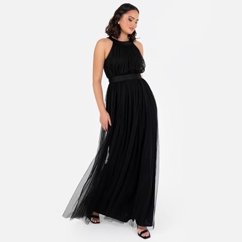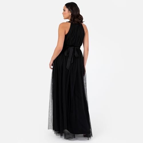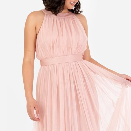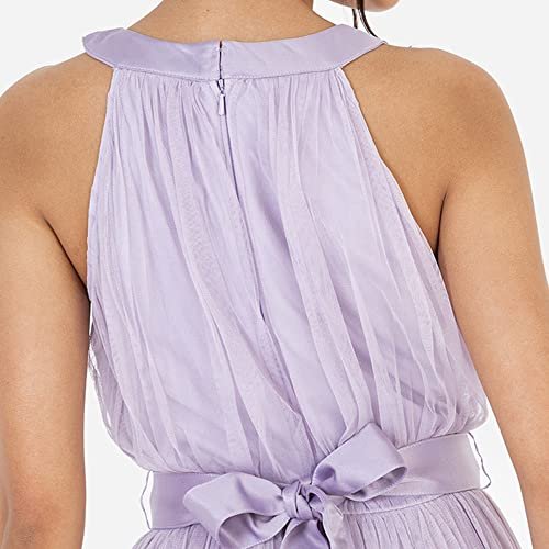 - Elegant damlång klänning: Chic halterkrage och mjuk kjol som vaknar från midjan och ner till golvet för att ge den här klänningen en touch av romantik. Denna eleganta damklänning har ett satinbälte som framhäver din midja. Denna långa aftonklänning har en osynlig dragkedja och satinmotiv som gör den till en elegant modell.