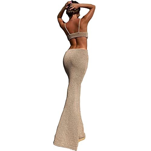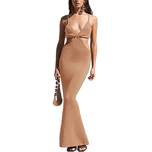Antopmen Women Spaghetti Straps Knitted Maxi Dresses Elegant Sexy Party Cut Out Backless Bodycon Slim Dress(Small, Khaki