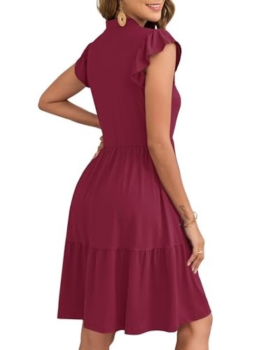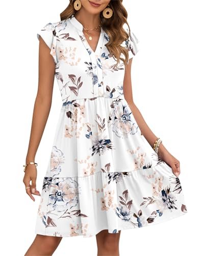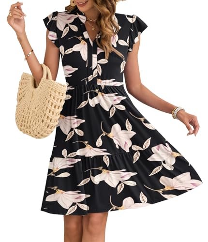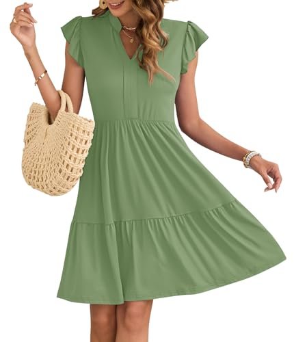 - Egenskaper: Dessa sommarklänningar för kvinnor har korta ärmar med kronbladsvolanger, v-ringning, hög midja, resår i midjan, enkel A-linjeklänning, knälång, ledig stil och sidfickor för små föremål