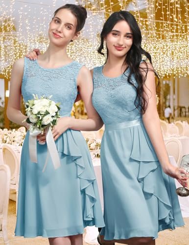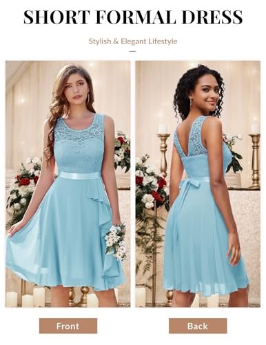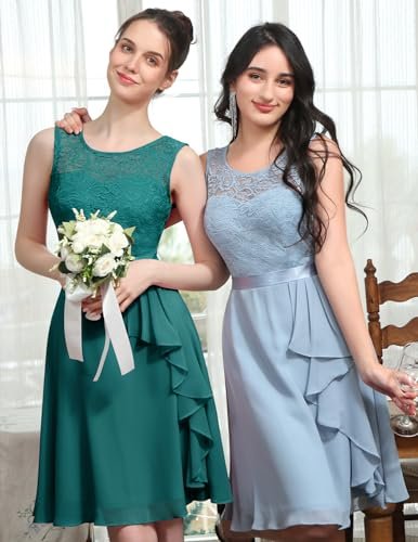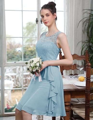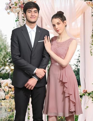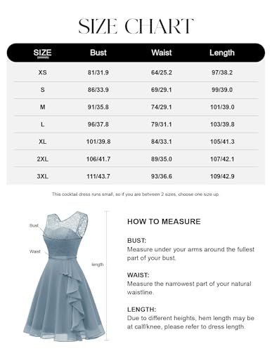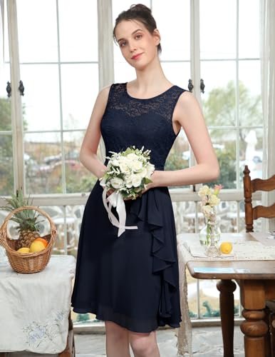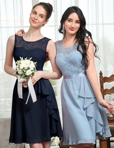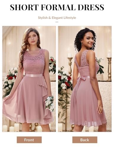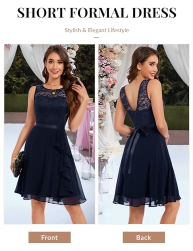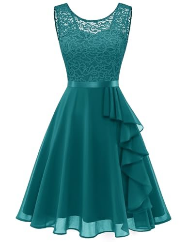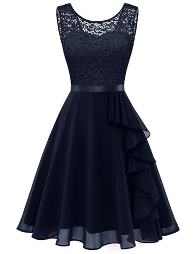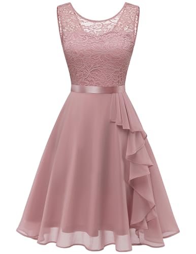 - Cocktailklänning dam elegant: A-linje, ärmlös, rund hals, knälång, inklusive fodrad knälång cocktailklänning. Delikat blommig spets och chiffong med rosett.