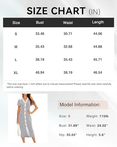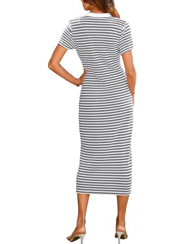 BTFBM Women Casual Summer Dresses Short Sleeve Striped Midi Dresses Decorative Button Ribbed Knit Party Dress(Grey,Medium)
