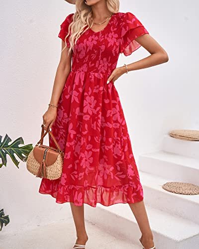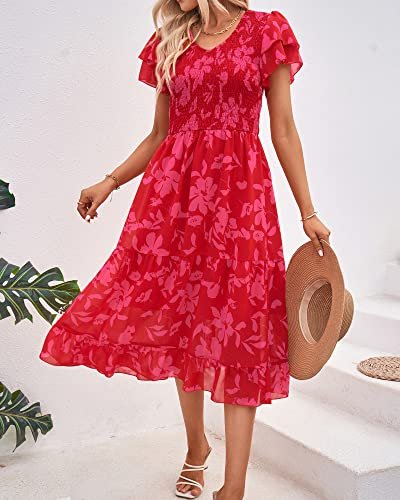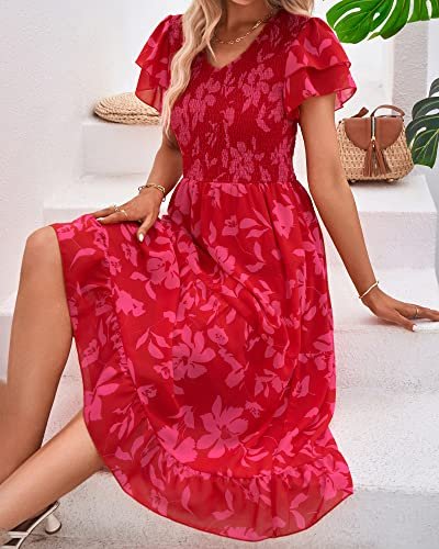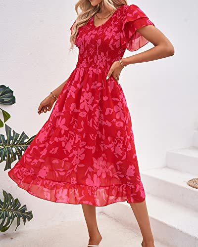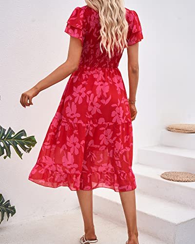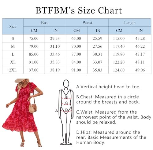 BTFBM Women Casual Summer Short Ruffles Tiered Sleeve Smocked Midi Dresses Bohemian Floral V Neck Wedding Guest Long Dresses