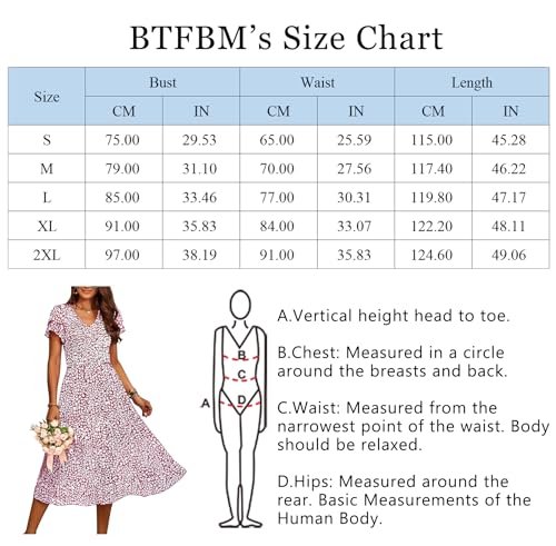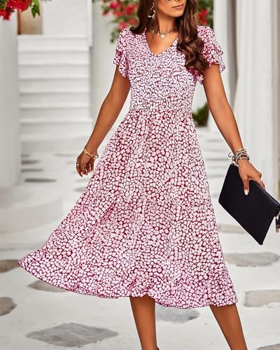 BTFBM Women Casual Summer Short Ruffles Tiered Sleeve Smocked Midi Dresses Bohemian Floral V Neck Wedding Guest Long Dresses(Floral Wine Red,X-Large)