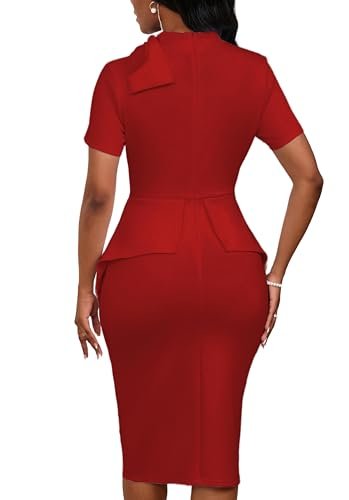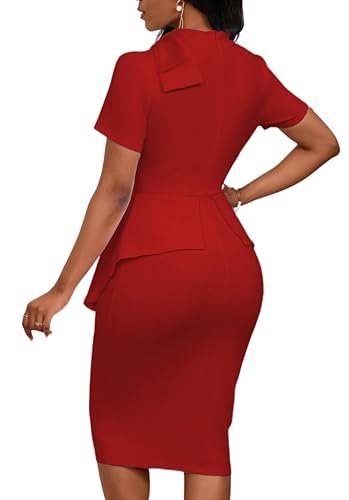 Church Dress for Women Fashion Peplum Bodycon Short Sleeve Work Dresses Bow Club Ruffle Pencil Formal Cocktail Dress Red XX-Large