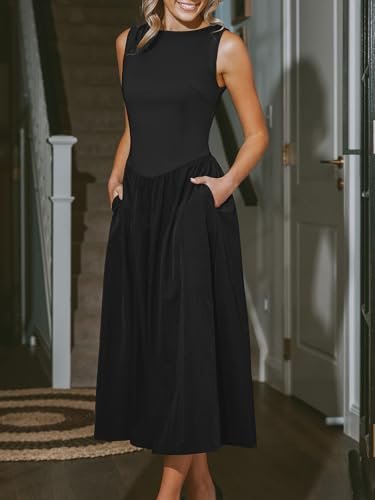 Unik design: Omfamna tidlös elegans med den svarta ärmlösa maxiklänningen! Med en smickrande rund hals och en elegant silhuett, fickdesign, erbjuder denna formella klänning enkel stil och sofistikering för alla tillfällen