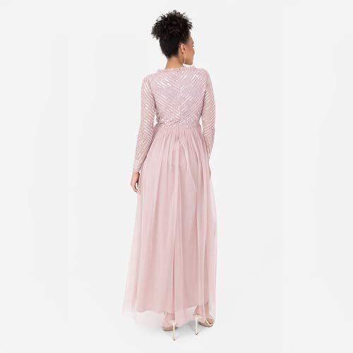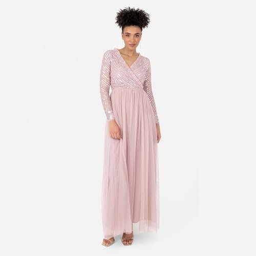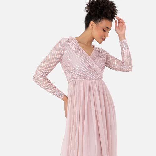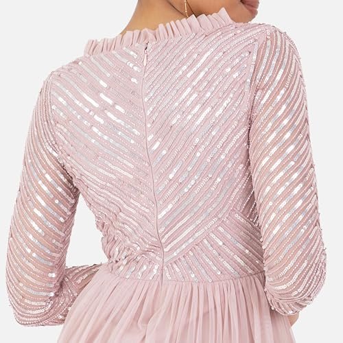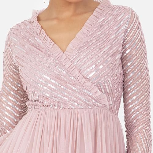 - MAXI EVENING KLÄNNING – Denna underbara maxiklänning för kvinnor har fantastiska stilanteckningar som en V-ringning formad av ett falskt hölje, sofistikerade långa ärmar, glittrande paljettutsmyckning och elegant volangkant. En golvsvepande tyllkjol flyter från en imperiummidja för att ge tillfället klänningen en romantisk finish. Det perfekta tillskottet till din garderob.