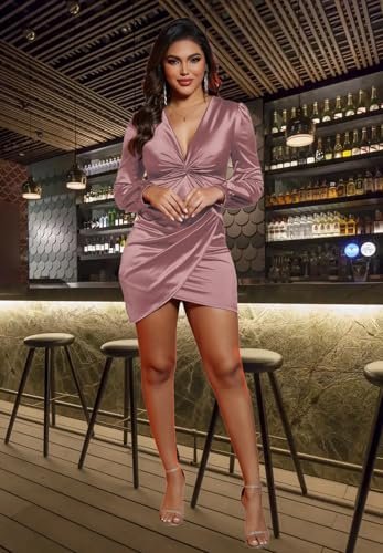 - Rynkad framsida, långärmad, djup V-hals, smal figurformad passform, solid färg, sommar och höst midi-klänning, höftinslagen silhuett, hög midja elegant cocktail med dragkedja på baksidan lätt att ta på och av.