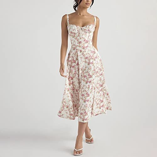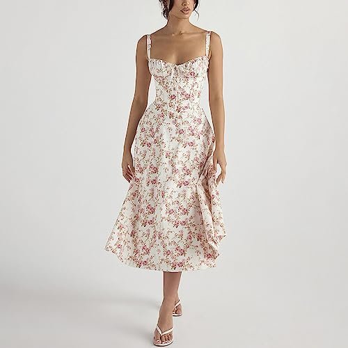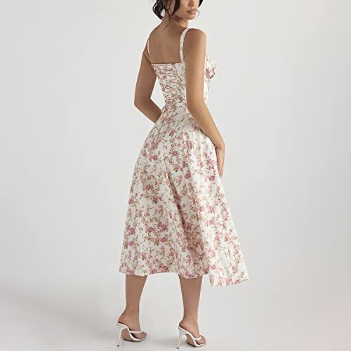 - Korsettklänning med midilängd för kvinnor: Den blommiga, avslappnade sommarklänningen med justerbara smala band, hög midja, korsett och volanglivstycke med dragsko framtill är sexig och charmig och kan visa upp din fantastiska feminina silhuett. Den ärmlösa solklänningen med lågt skuren korsett och foder kan perfekt visa upp din smala midja. Snörningen på baksidan ger en graciös vintagekänsla. Dra åt remmarna utefter olika kroppsformer. Med en slits framtill, som kan visa dina benlinjer när du går eller står.
