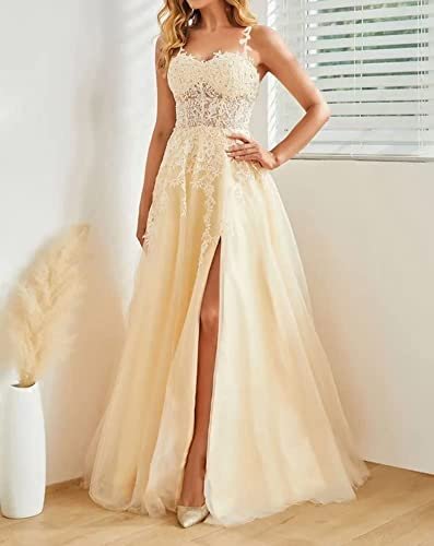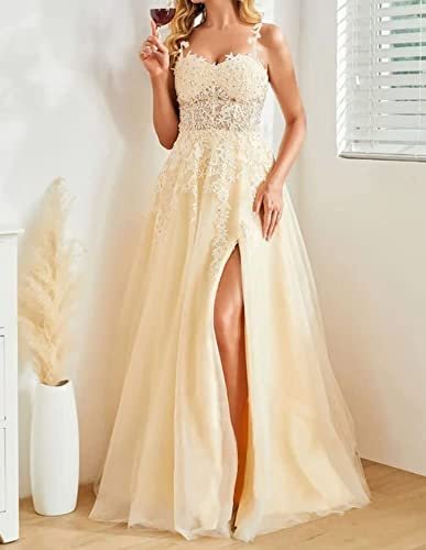 • Spetsapplikationer axelbandslösa balklänningar 2023 tyll balklänning med slits lång A-linje formell klänning för kvinnor