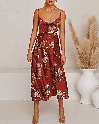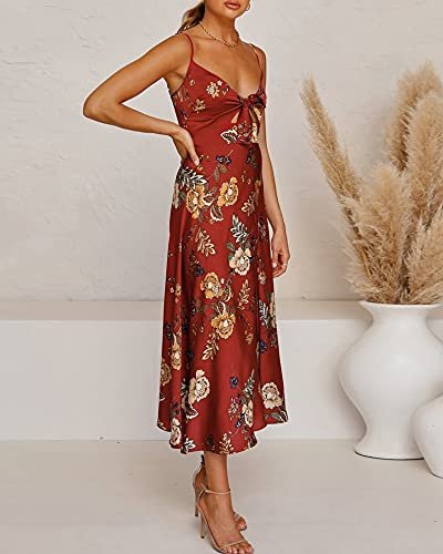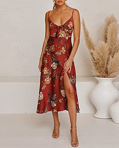 Fashionme Women Spaghetti Strap Midi Satin Dresses Tie Front Backless Split Summer Casual Floral Dress Hollow Flowy Slip Dress Sundresses Wedding Guest Beach Cocktail Graduation Maroon
