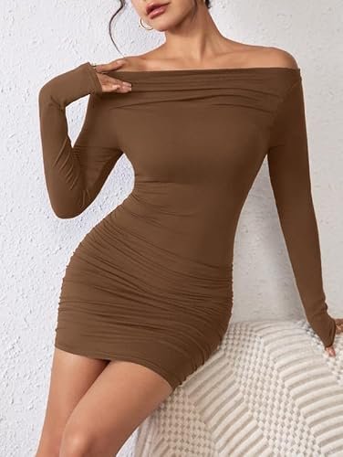 • ღ Detalj: Kvinnors miniklänning med off the shoulder/en axel, långärmad, längd över knäet, rynkade detaljer på sidan, kramar din kropp perfekt och visar din kvinnlighet.