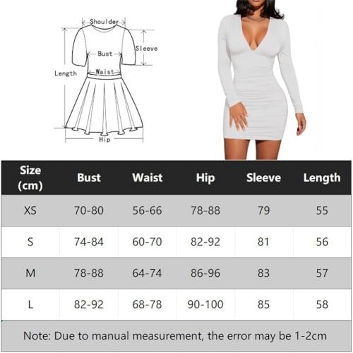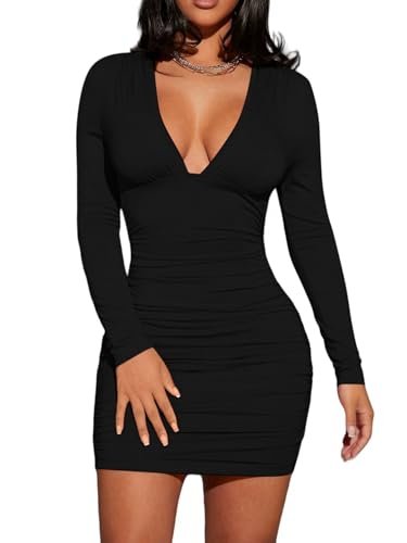 Långärmad kort klänning: Denna utgående bodyconklänning har djup V-hals, rynkad hög midja, långa ärmar, mini längd, bodycon-passform, över knä längd, festklänning för kvinnor, sexig klubb, nattklänningar för kvinnor, gör dig trendig och sexig.