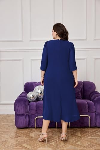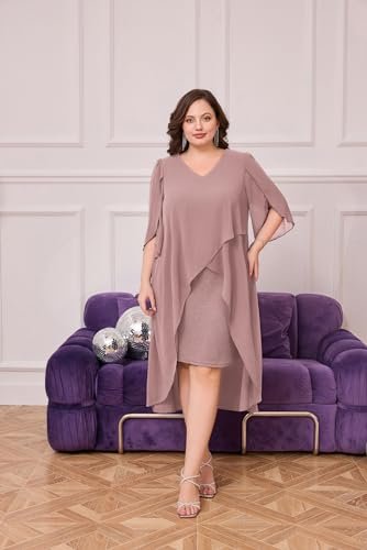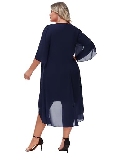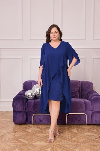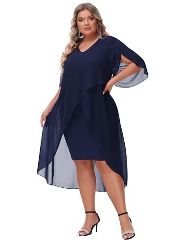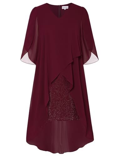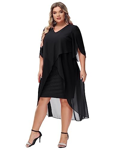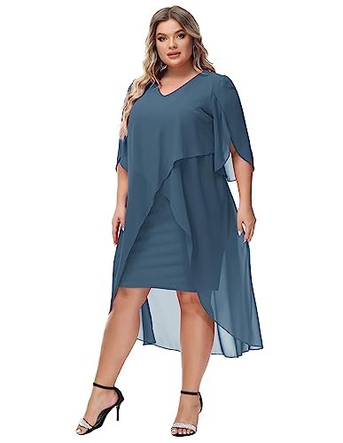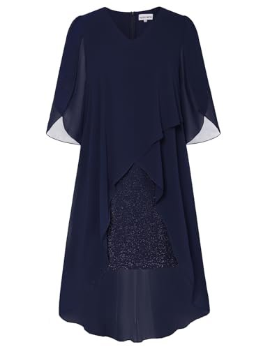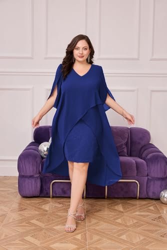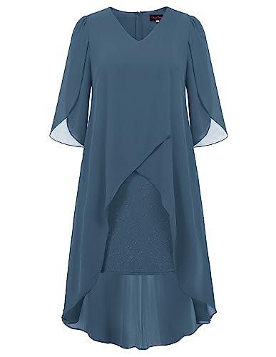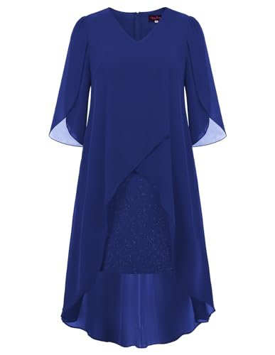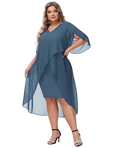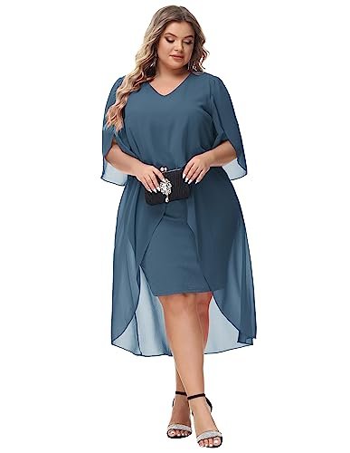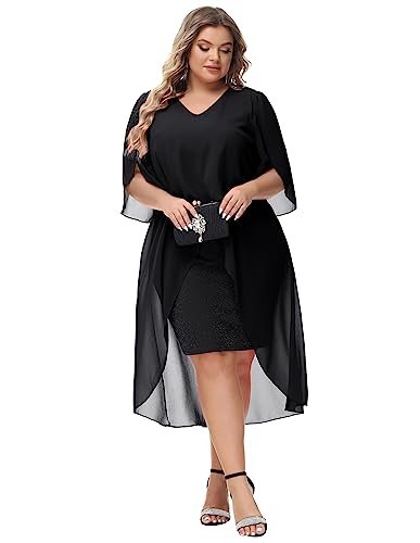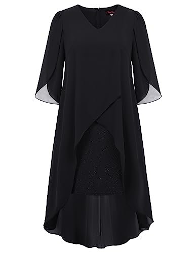 Cocktailklänning i plusstorlek: Eleganta chiffongklänningar med v-hals har flödande volang 3/4-ärm, mjukt chiffongöverdrag ger dig flödande asymmetrisk fåll, accentuerar dina kurvor perfekt och döljer bristen men ändå smickrande och vacker.