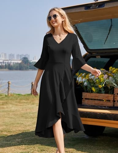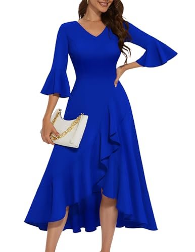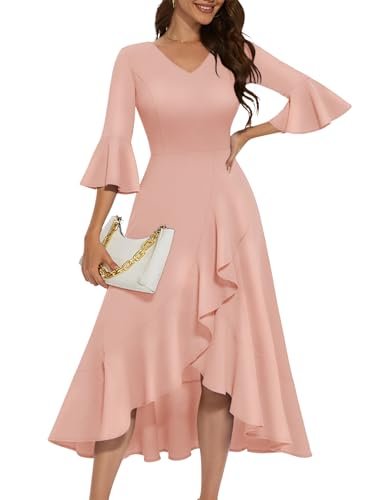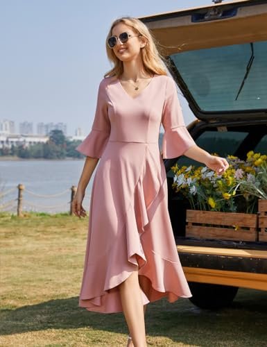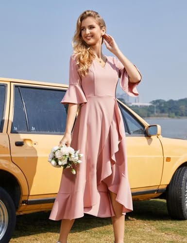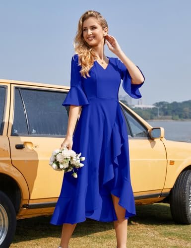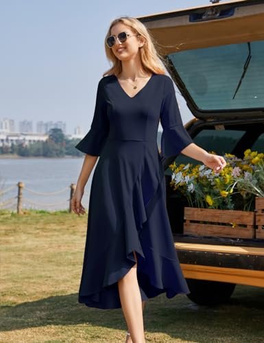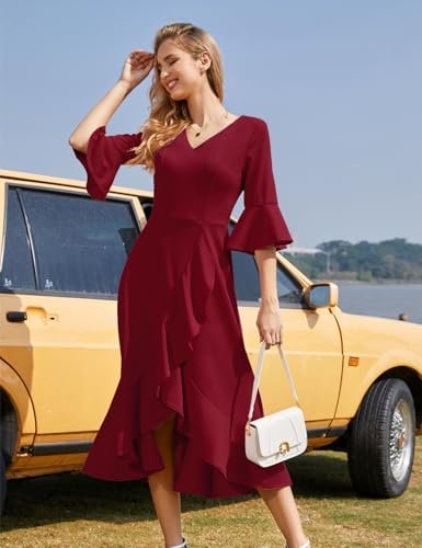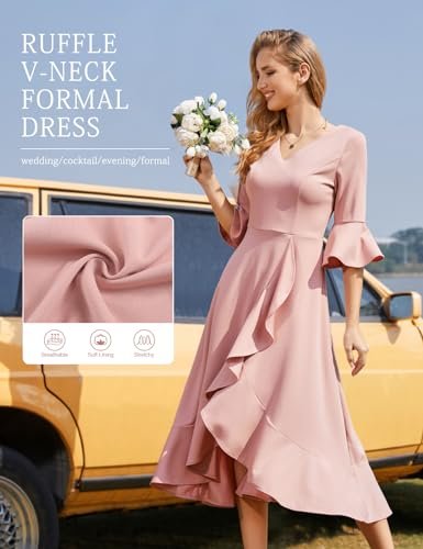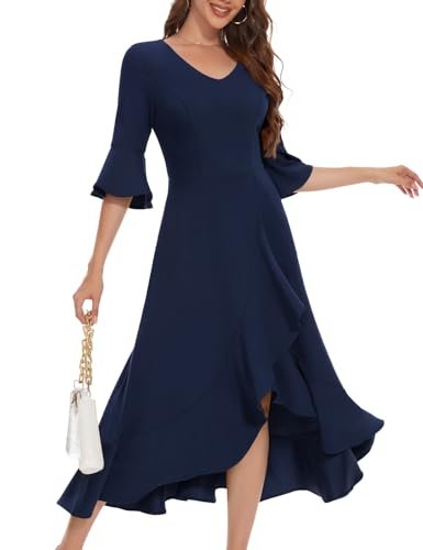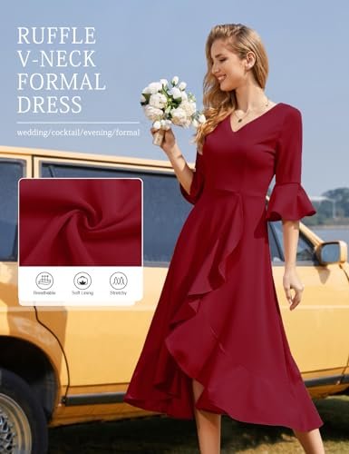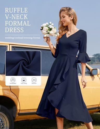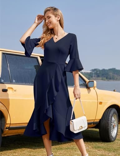 Elegant design: Våra formella klänningar för kvinnor har en elegant omlottad fåll, V-ringad volanger och knälång A-linje-snitt, perfekt för cocktailfester, vårbröllop och examensevenemang, vilket garanterar att du ser elegant och sofistikerad ut vid varje evenemang