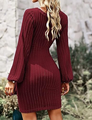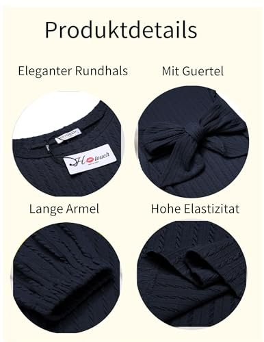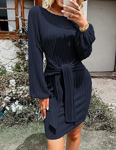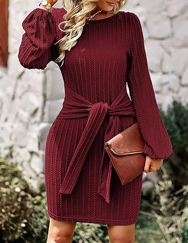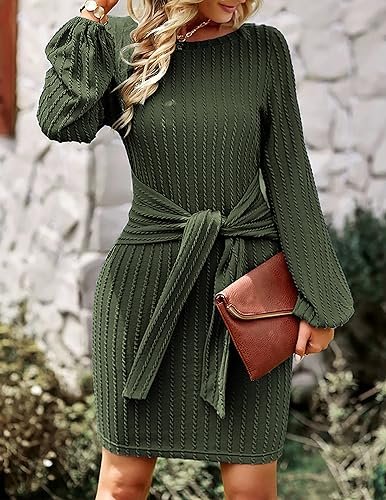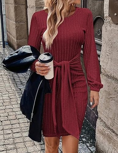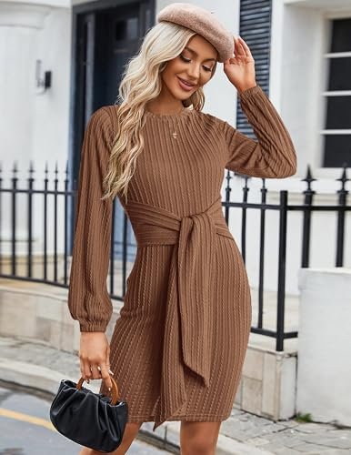 HOTOUCH Stickad klänning dam långärmad vardaglig klänning med rund hals elegant tröjklänning, Borwn, M