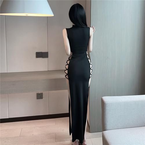 Dam rave-kläder gotisk klänning, mockhals, ärmlös, hög dubbel slits, åtsittande, visar din perfekta figur