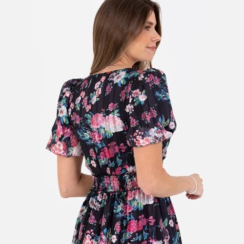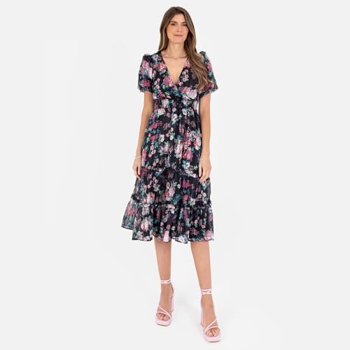 - Blomtryck DRESSES Midiklänning för kvinnor har en V-halsringning formad av en faux-wrap top och shorts, puffärmar. Tillverkad av ett lyxigt chiffongtyg, alla tre färglägen har skimrande guldtrådaktiviteter på blommiga tryck, medan ruggad skjortringdetalj på midjebandet hjälper till att skapa en passform och flare silhuett. Djurrufflar på kjolen lägger till stilnoterna, vilket garanterar elegans för alla tillfällen.