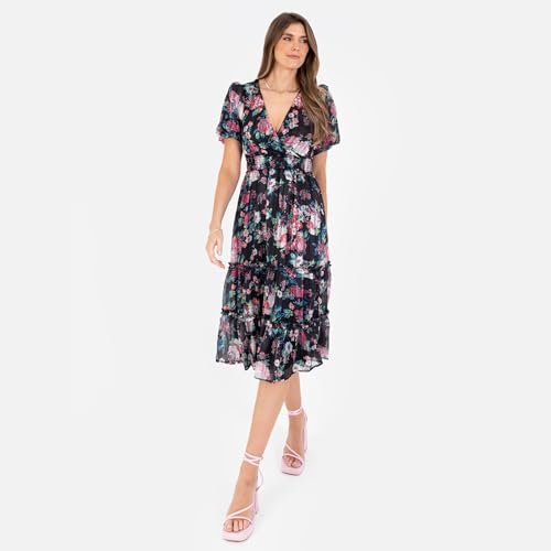 - Materialsammansättning: Modern av 100 % polyester chiffong med metallisk guldtråddetalj, denna blommiga klänning sömlös blandning av stil och komfort med skjortmidjan, faux-wrap topp och ramtrim.