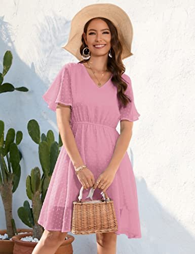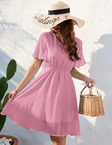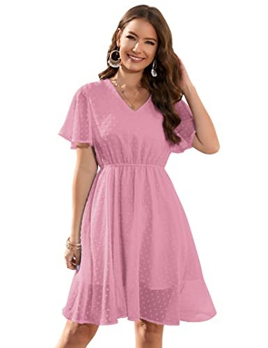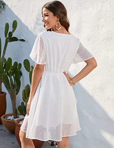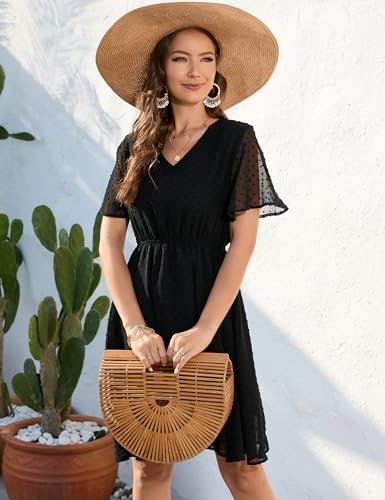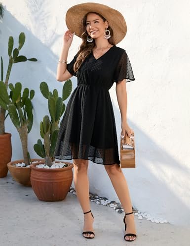 - ⭐Eleganta klänningar för kvinnor miniklänning hög midja v-ringning kortärmad A-linje strandklänningar tyllklänning med volanger