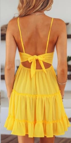 Sexig kort slipklänning för kvinnor med spaghettiband, v-ringning, delikat spetsblommigt mönster, resår i midjan, pilbåge på ryggen, öppen rygg, veck, rufsad fåll, slim fit, 5 enfärgade tillgängliga.