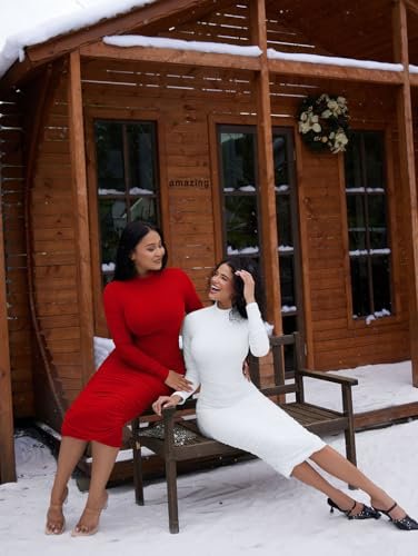 LAGSHIAN Women's Cocktail Bodycon Long Sleeve Mock Neck Mesh Ruched Midi Party Dress Red