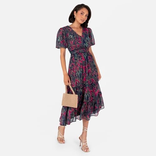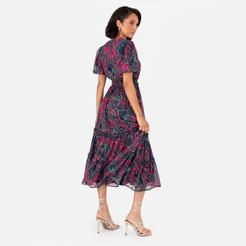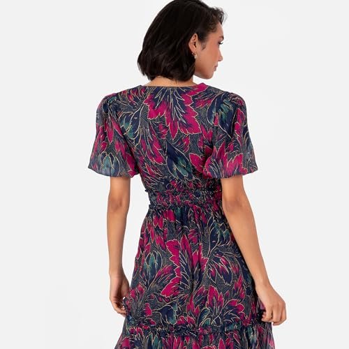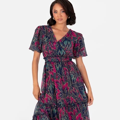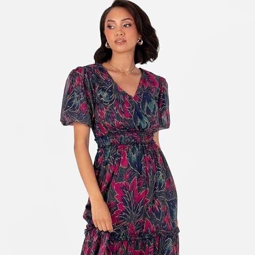 BLOMMIGA TRYCK: Midi-klänningen för kvinnor har en V-ringning formad av en falsk wrap topp och kort, puffärmar. Tillverkad av ett lyxigt chiffongtyg, alla tre färgsättningarna har skimrande guldtrådaccenter på blommönster, medan rynkade skjortdetaljer på linningen hjälper till att skapa en passform och utsvängd silhuett. Nivåer på kjolen bidrar till stilnoterna, vilket garanterar elegans för alla tillfällen.