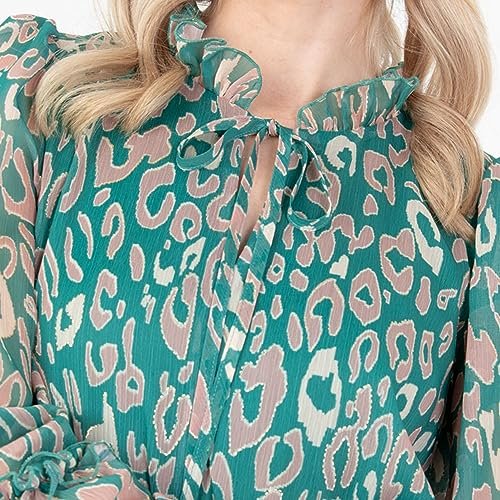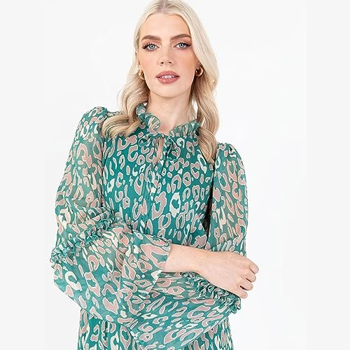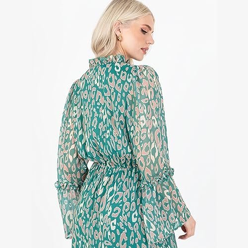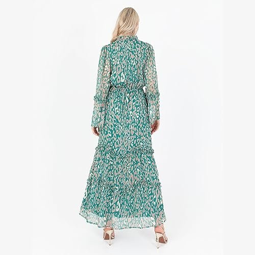 MAXI KLÄNNINGAR FÖR KVINNOR – Denna fantastiska maxiklänning för kvinnor har överdådiga stilanteckningar som hög halsringning, långa ärmar och volangdetaljer upprepas genom kragen, ärmarna och lång kjol. A-linjeklänningen för kvinnor har ett iögonfallande djurtryck. Det perfekta tillskottet till din garderob för tillfällen den här säsongen.