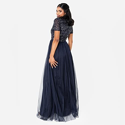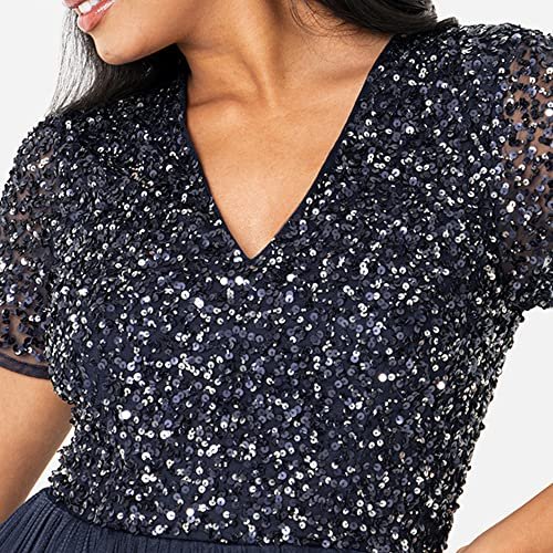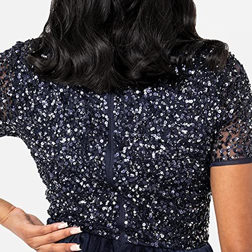 MAXI KLASSISK KLÄNNING – Denna klänning för kvinnor är gjord av, faller vackert på plats, tyll lång botten och skimrande, kortärmad paljetttopp. Aftonklänningen har en osynlig dragkedja.