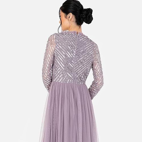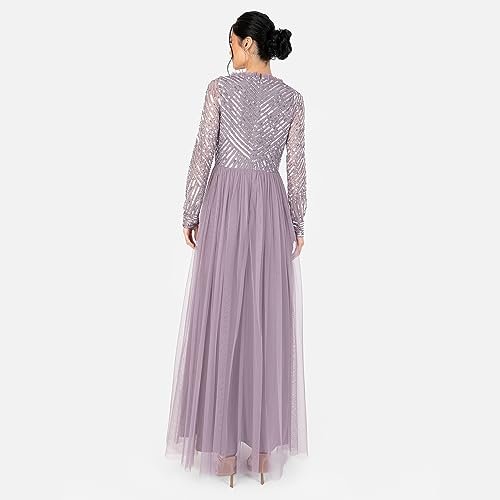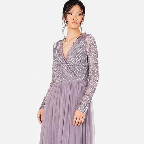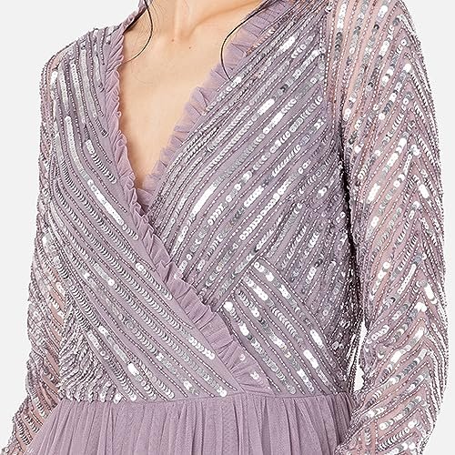 MAXI EVENING KLÄNNING – Denna underbara maxiklänning för kvinnor har fantastiska stilanteckningar som en V-ringning formad av ett falskt hölje, sofistikerade långa ärmar, glittrande paljettutsmyckning och elegant volangkant. En golvsvepande tyllkjol flyter från en imperiummidja för att ge tillfället klänningen en romantisk finish. Det perfekta tillskottet till din garderob.