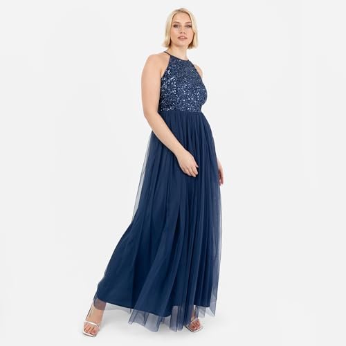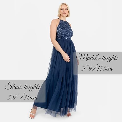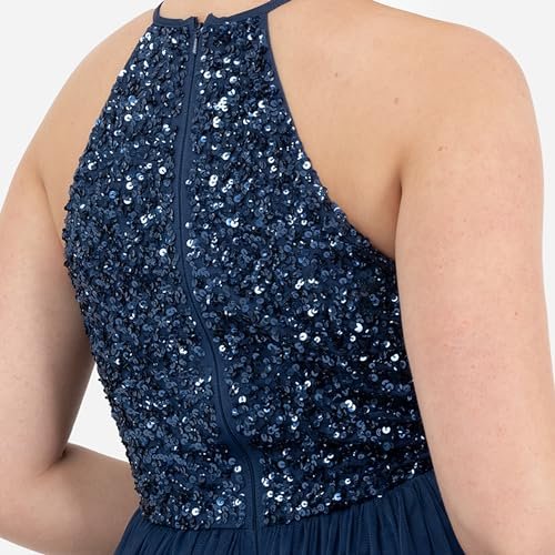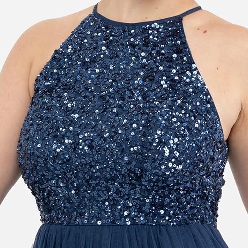 MAXI EVENING KLÄNNINGAR – har en elegant halterneck och en svepande mjuk tyllkjol som flyger från midjan vilket ger klänningen en romantisk finish. Denna klänning för kvinnor har en skimrande handsydd paljettutsmyckning, vilket gör att du känner dig som en stjärna. Aftonklänningen har en osynlig dragkedja.