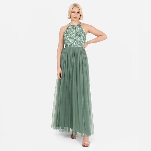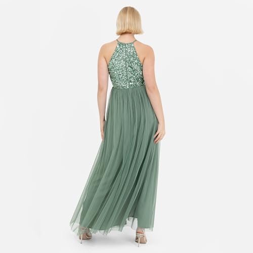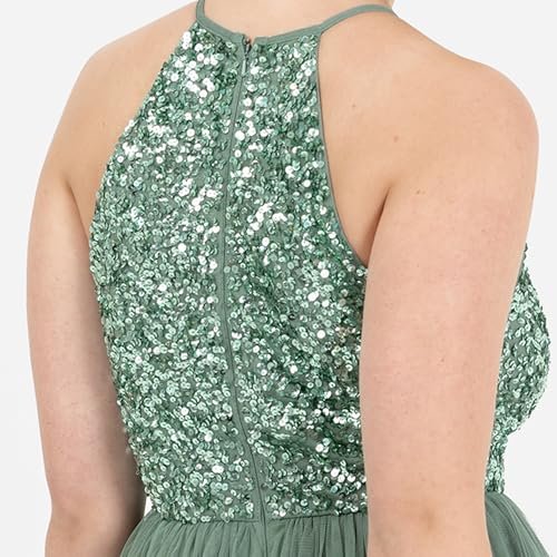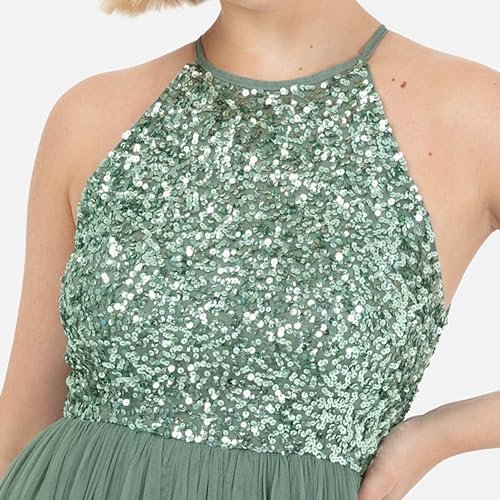 MAXI EVENING KLÄNNINGAR – har en elegant halterneck och en svepande mjuk tyllkjol som flyger från midjan vilket ger klänningen en romantisk finish. Denna klänning för kvinnor har en skimrande handsydd paljettutsmyckning, vilket gör att du känner dig som en stjärna. Aftonklänningen har en osynlig dragkedja.
