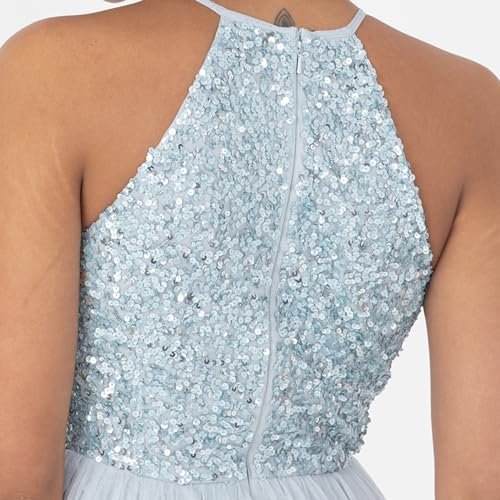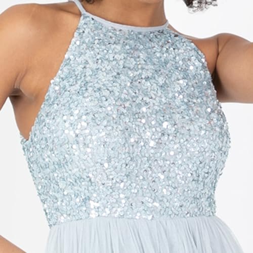 MAXI EVENING KLÄNNINGAR – har en elegant halterneck och en svepande mjuk tyllkjol som flyger från midjan vilket ger klänningen en romantisk finish. Denna klänning för kvinnor har en skimrande handsydd paljettutsmyckning, vilket gör att du känner dig som en stjärna. Aftonklänningen har en osynlig dragkedja.