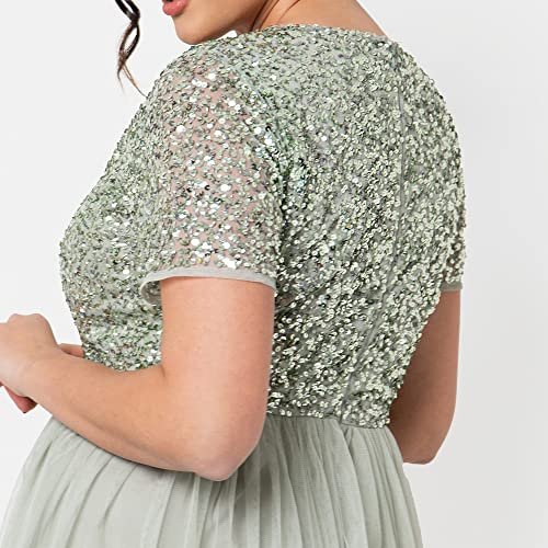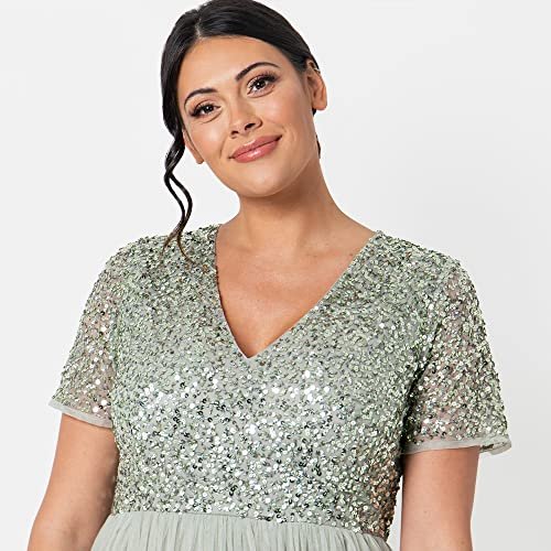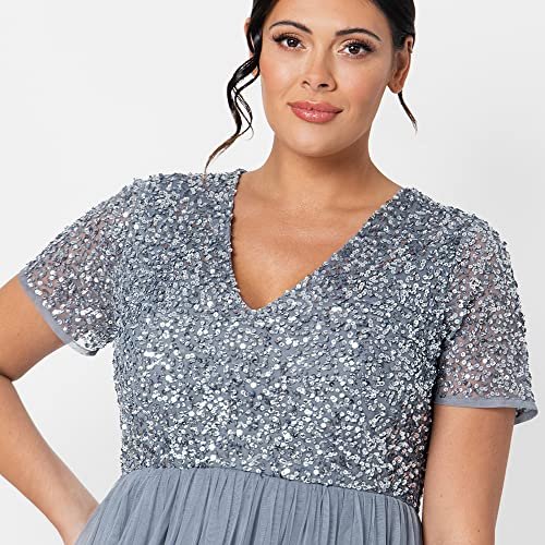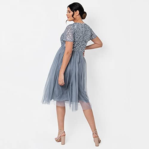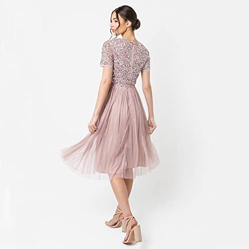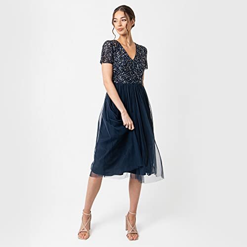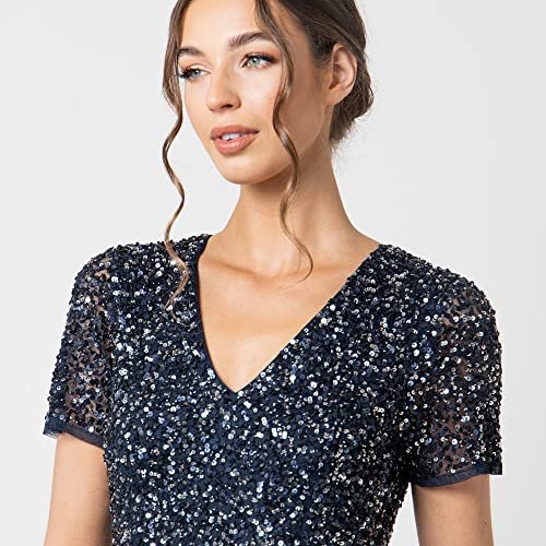 - Midi-kvällsklänning: Har en chic V-ringad och en mjuk tyllkjol som smickrar från midjan och ger klänningen en romantisk finish. Denna klänning för kvinnor har en skimrande, handsydd paljettdekoration på toppen så att du känner dig som en stjärna. Aftonklänningen är försedd med ett osynligt blixtlås.
