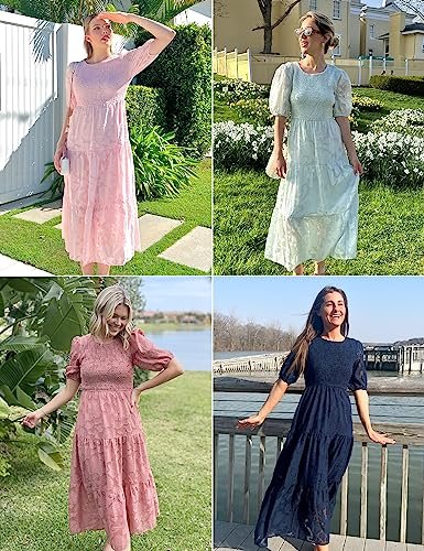 MEROKEETY Women's 2025 Summer Puff Sleeve Smocked Floral Dress Crewneck Lace Flowy Tiered Midi Dresses,Black,M