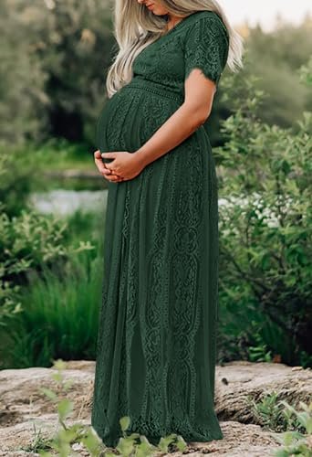 MEROKEETY Women's 2025 V Neck Short Sleeve Floral Lace Wedding Dress Bridesmaid Cocktail Party Maxi Dress, DarkGreen, X-Large