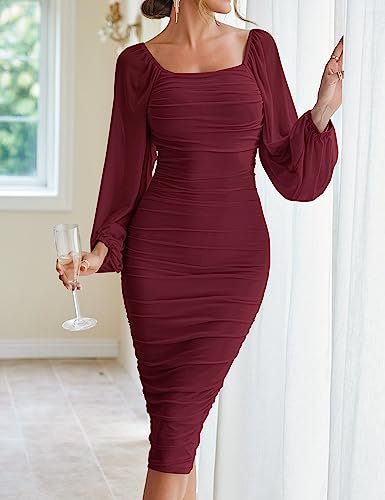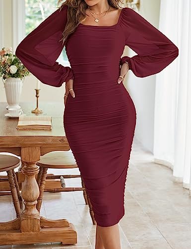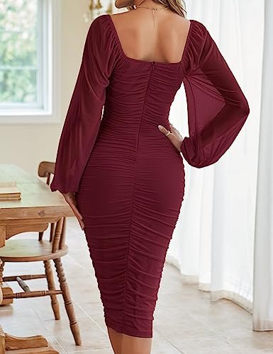 MEROKEETY Women's Long Puff Sleeve Ruched Bodycon Dress Square Neck Cocktail Party Wedding Guest Midi Dresses,WineRed,S