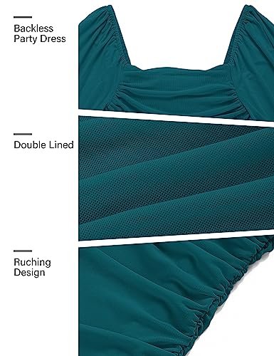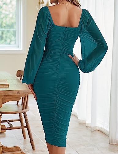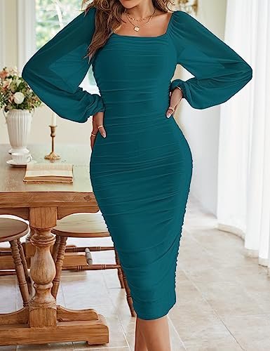 MEROKEETY Women's Long Puff Sleeve Ruched Bodycon Dress Square Neck Cocktail Party Wedding Guest Midi Dresses,Teal,L