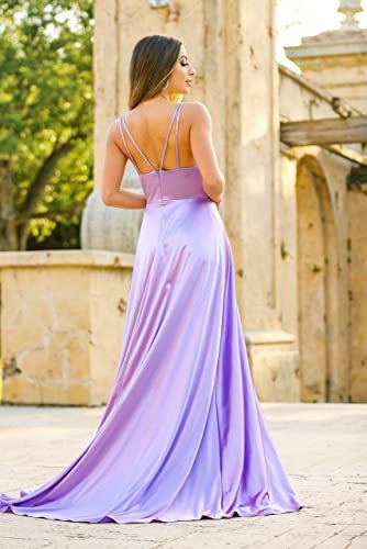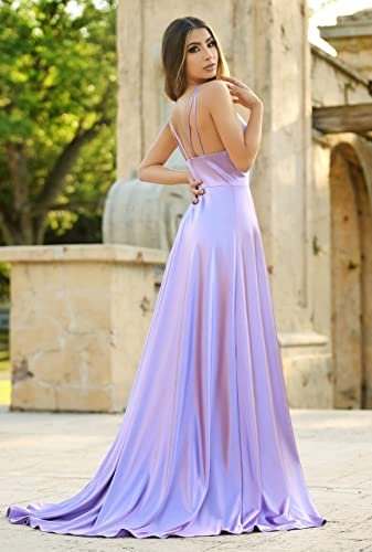 🌸 Satin delad lång balklänning, sexig djup V-hals framtill. V-urringning