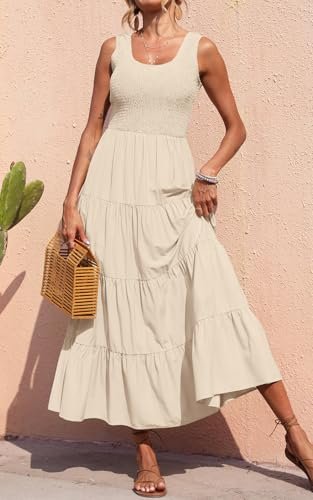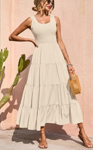 PRETTYGARDEN Sleeveless Casual Shirred Tank Top Tiered Maxi Dress Smocked Summer Dresses for Women 2025 Beach Long Sundress (Apricot,X-Large)