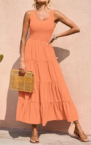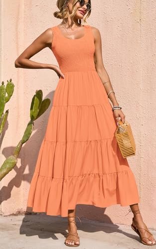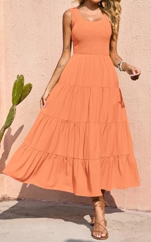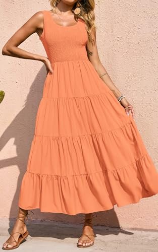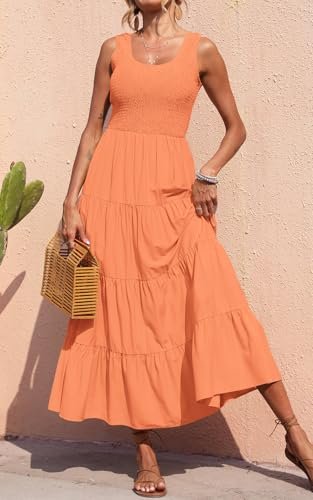 PRETTYGARDEN Women's 2025 Summer Bohemian Tank Tiered Maxi Dress Sleeveless Smocked Ruffle Tiered Beach Maxi Sun Dress (Orange,Large)