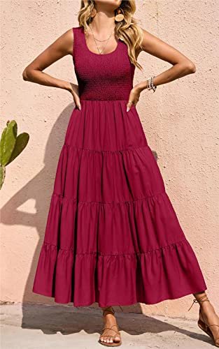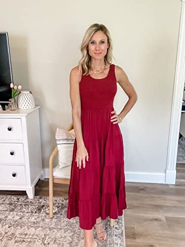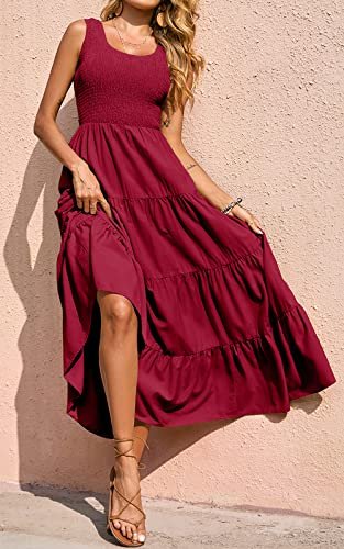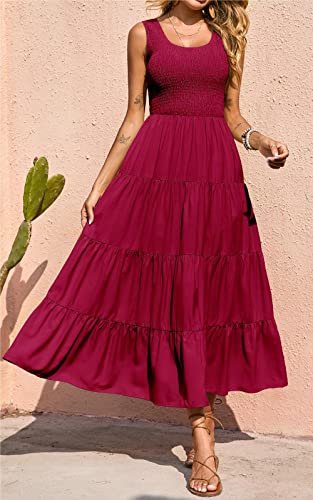 PRETTYGARDEN Women's Casual Loose Plain Maxi Sundress Smocked Tank Dress Sleeveless Summer Beach Tiered Long Dresses (Wine Red,Small)