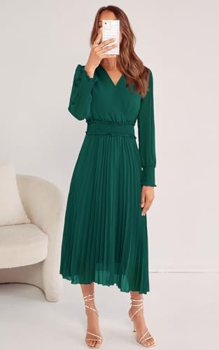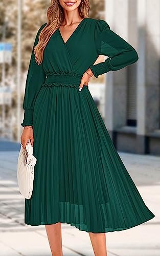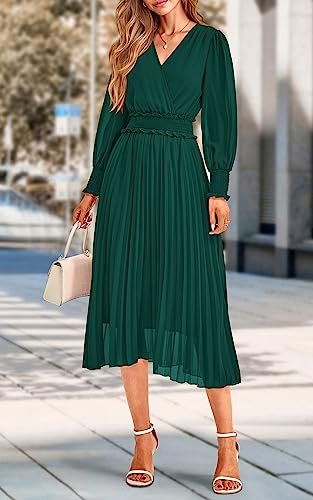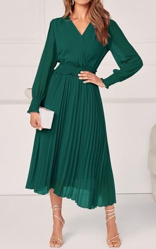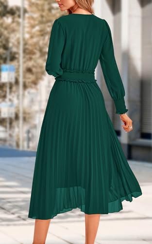 PRETTYGARDEN Womens Wrap V Neck Dresses for Wedding Guest Casual Pleated Long Sleeve Midi Dress Ruffle Smocked Long Dress (Dark Green,Large)
