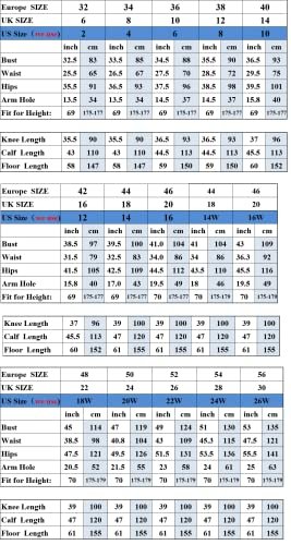 - Storlek: Se storlekstabellen till vänster innan du beställer, support skräddarsydd. Om du behöver anpassning, skicka oss mått följ våra mätinstrument vänster, vi behöver mått inkluderat, byst, midja, höft, längd från axel till golv, axel, biceps, handled, armlängd, vi kommer att göra klänningen att följa dina mätningar;