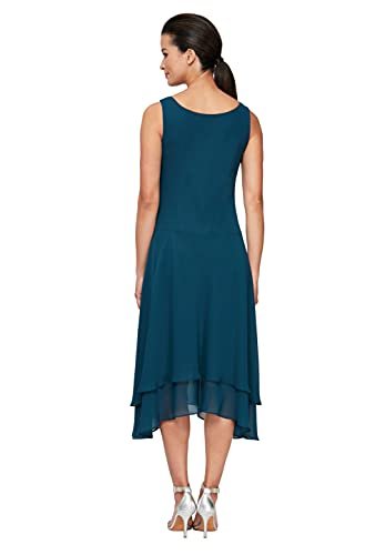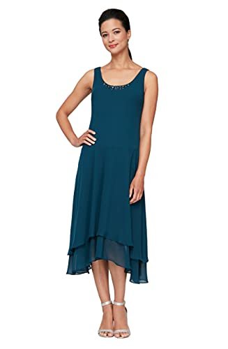 S.L. Fashions Women's Mother of The Bride Dress with Embellished Neckline & Shoulder, Wedding Guest (Petite and Regular Sizes), Mid Teal, 8P
