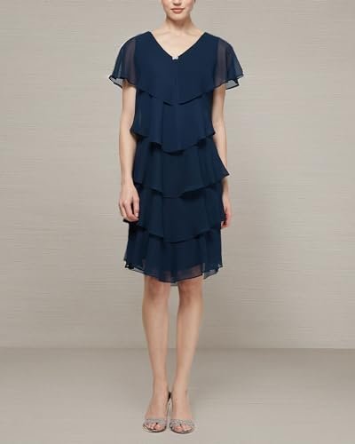 S.L. Fashions Women's Short Sleeve Tiered Chiffon Cocktail Dress, Wedding Guest Gown (Petite and Regular Sizes), New Navy, 10