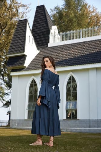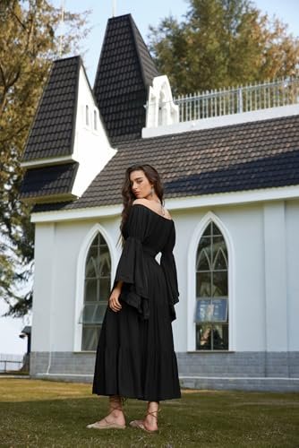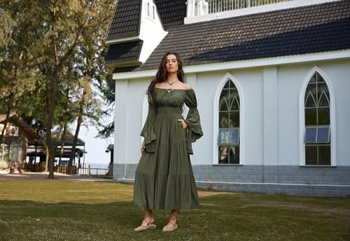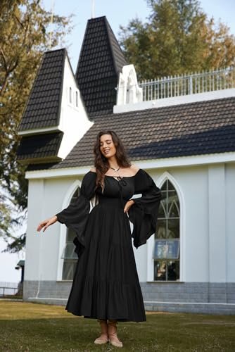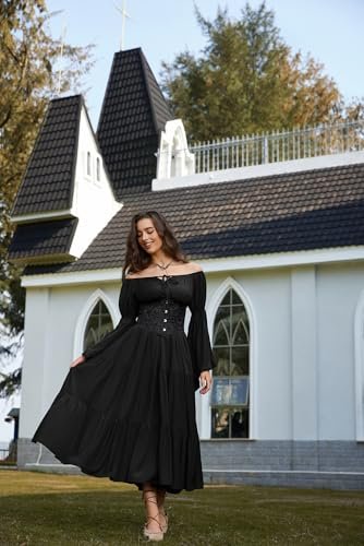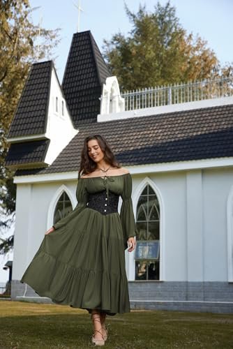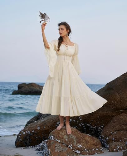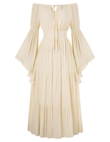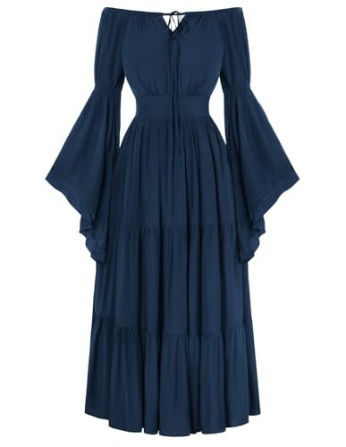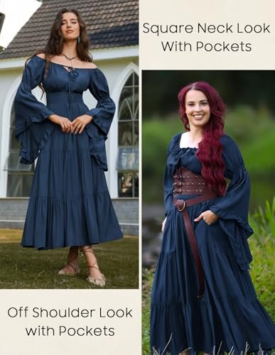 - Funktioner: Denna renässansinspirerade klänning har en stretch fyrkantig halsringning och kan bäras på en eller båda axlarna. De klockformade ärmarna samlas i mitten för ökad dimension och elegans, och sidoteckningarna säkerställer enkel att ta på och av utan att förlora den övergripande formen